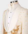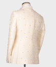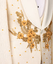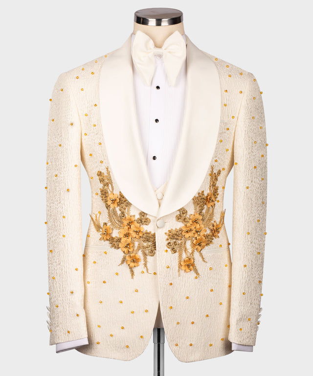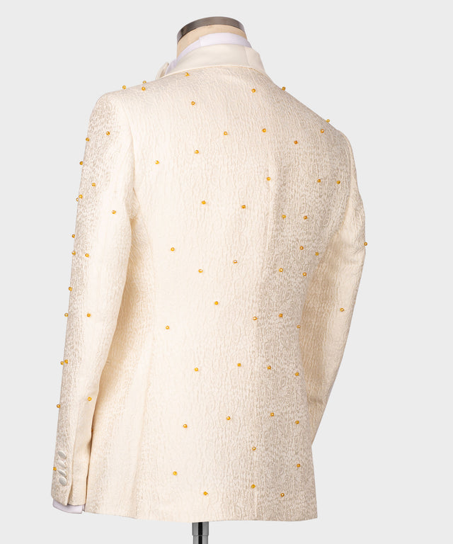 Elegant tailored three-piece suit in stretch wool with rhinestone embellishment.