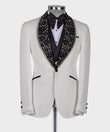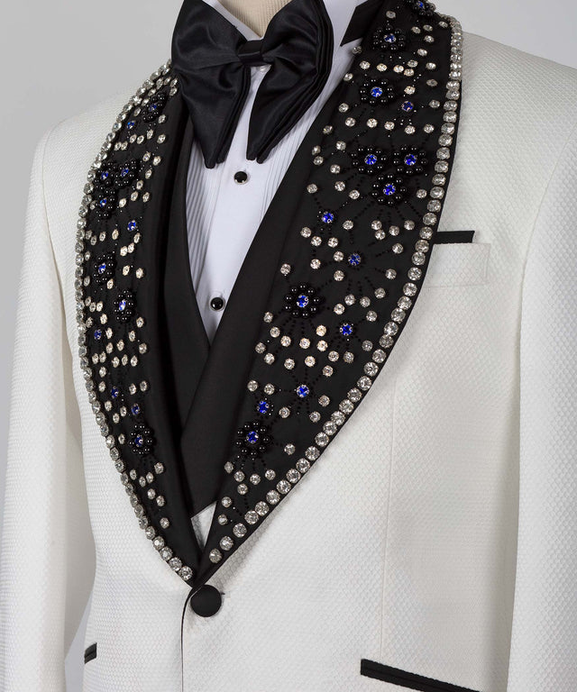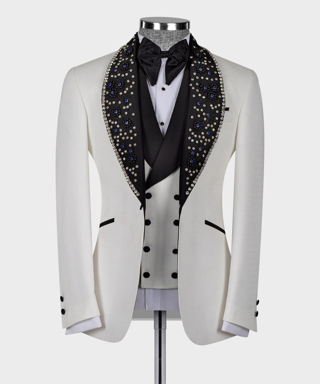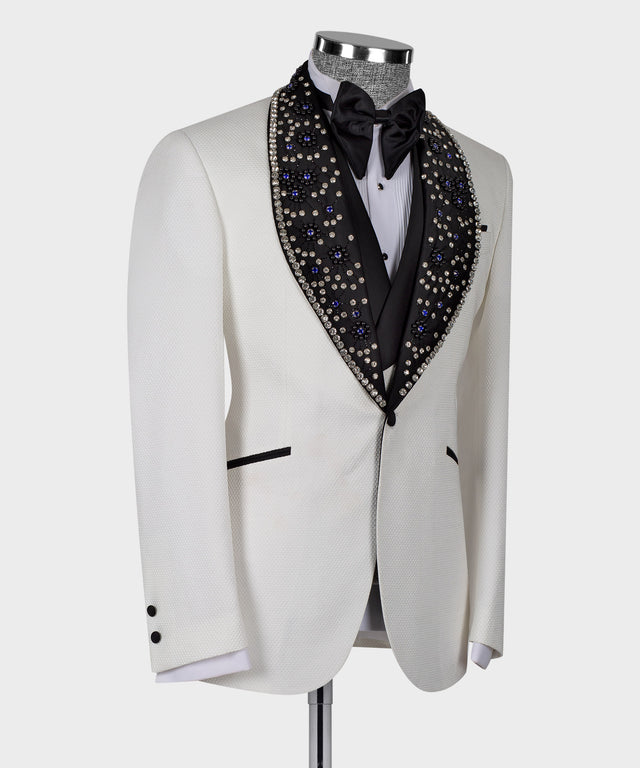 Elegant tailored three-piece suit in stretch wool with rhinestone embellishment.