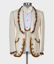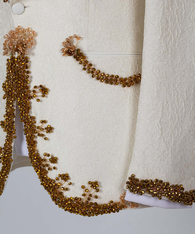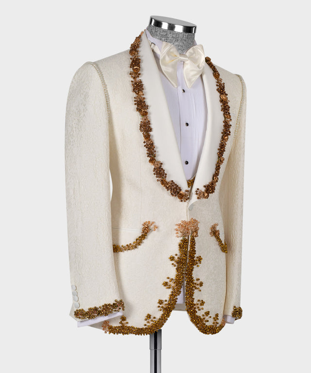 Elegant tailored three-piece suit in stretch wool with rhinestone embellishment.